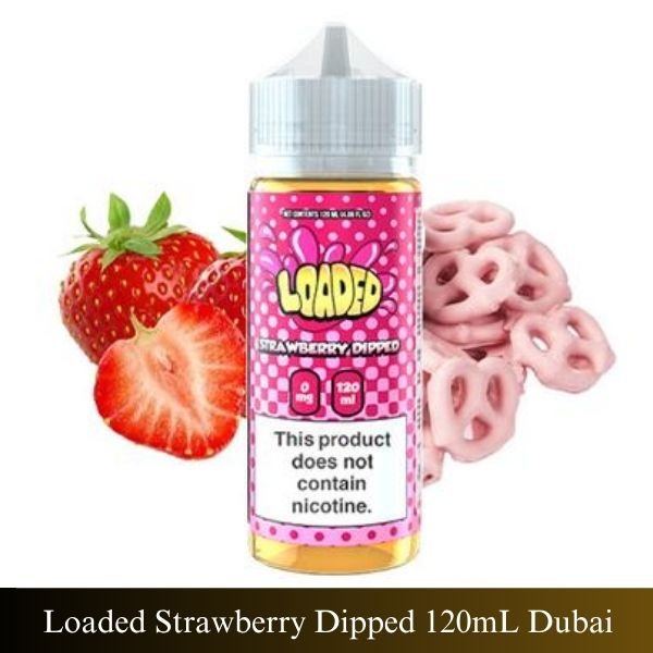 Indulge in Loaded Strawberry Dipped 120mL – sweet strawberries, creamy drizzle & pretzel crunch. A rich dessert vape made for UAE flavor lovers.